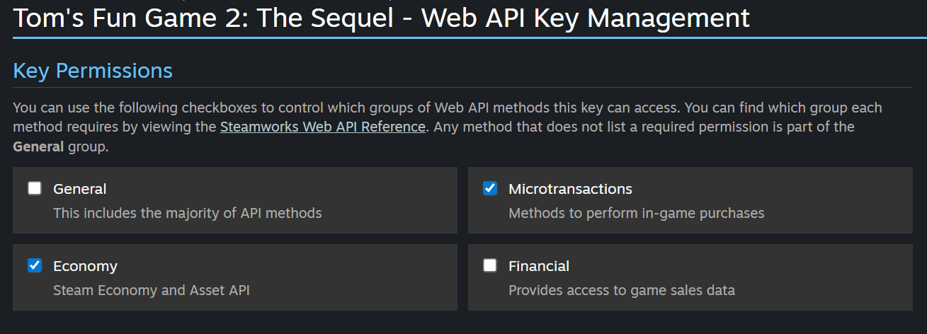 For existing Web API keys, we haven't changed anything that would interrupt a game or a developer. Financial Web API keys are automatically set to just support game sales data, and normal Web API keys are automatically set to support General, Economy, and Microtransaction calls, just as before.